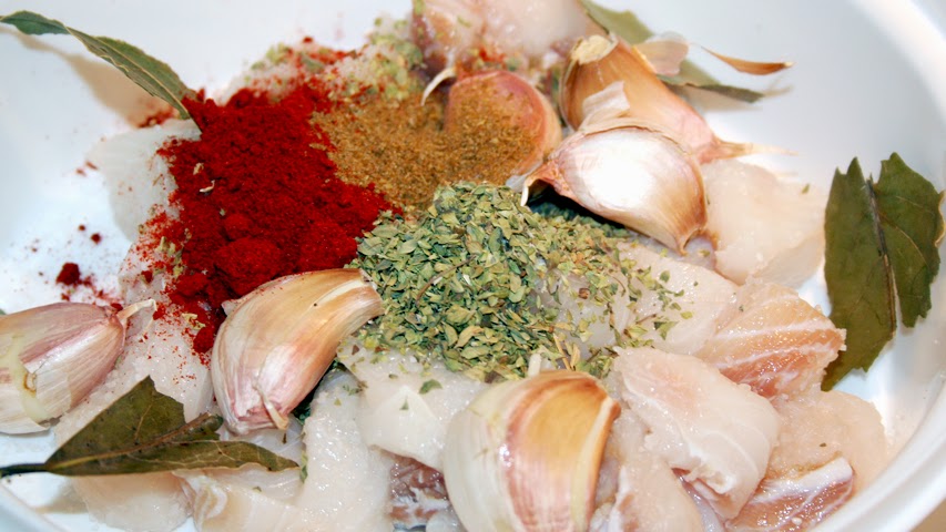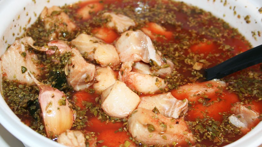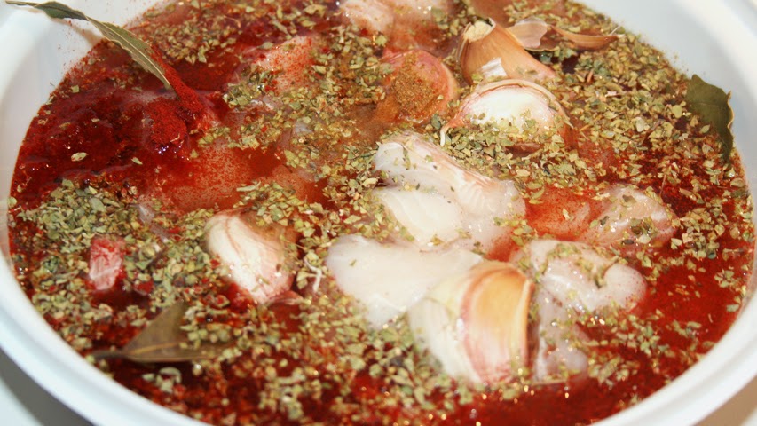 El adobo consiste en una mezcla de ajos machacados, laurel, pimentón, comino oregano, sal, vinagre y agua