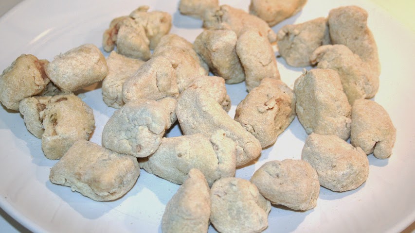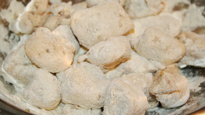 Enharina los trozos de cazón con harina recia (harina de freír pescado) sacudiendo el exceso de harina.