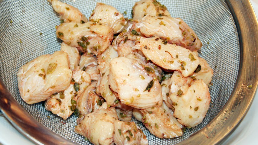 Tras dejar el pescado toda la noche en adobo, escurro el líquido y seco un poco el pescado para que no salte mucho el aceite.