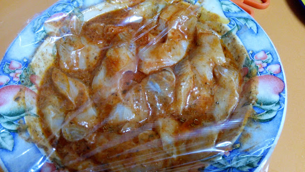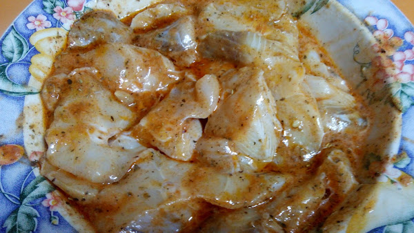 Metemos el cazón en el adobo, lo removemos bien para que se impregne todo el pescado.