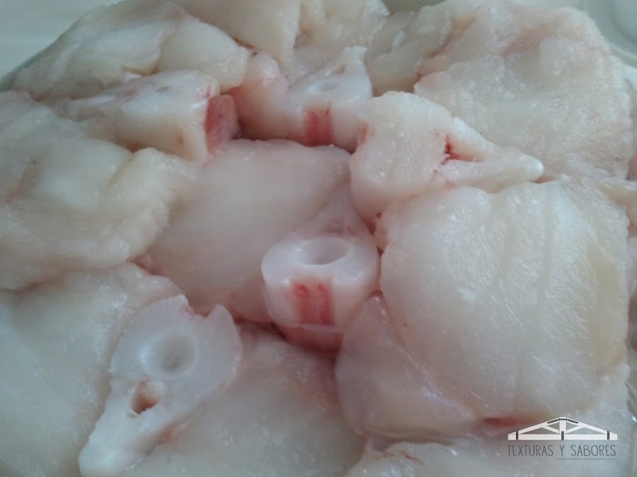 A la hora de comprar el cazón o u otro pescado blanco, el pescadero nos lo dará en rodajas gruesa. Ya en casa lo que haremos es cortarlo en tacos mas pequeños tipo (de un solo bocado) En esta ocasión prefiero dejarlo tal cual esta, en rodajas.