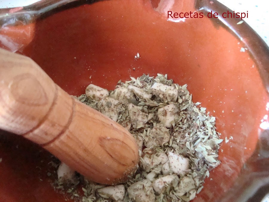 En un mortero poner los ajos troceados, la sal, el pimentón y las especias, machacar muy bien.