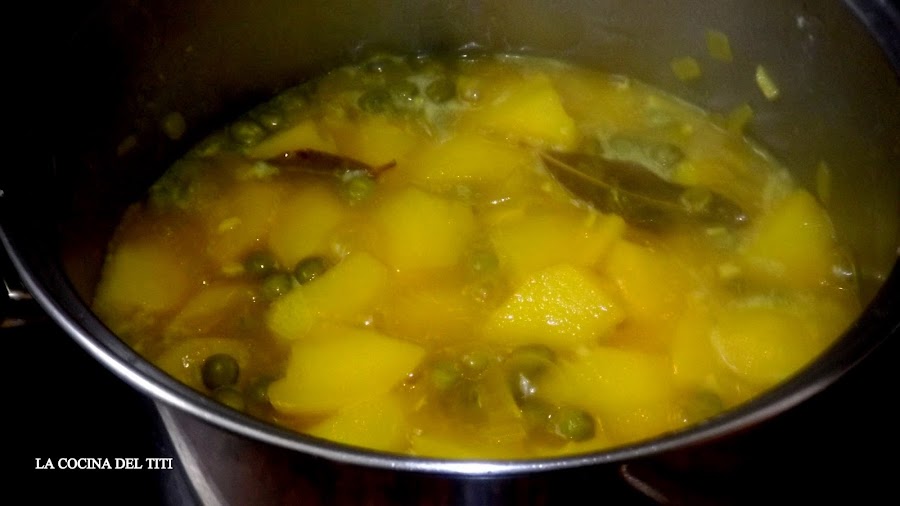 5º Cuando la patata empiece a ponerse tierna metemos el cazon y dejaremos que termine de hacerse.