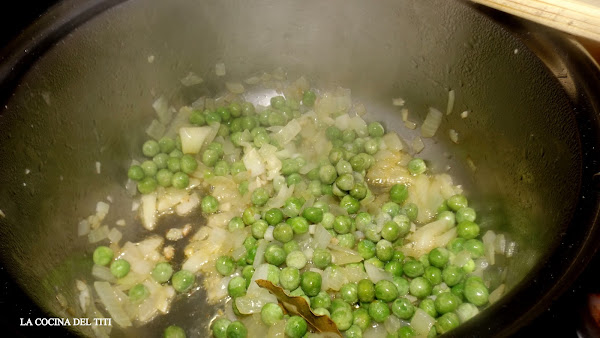 2º Pondremos el aceite de oliva con el laurel, ajo y cebolla finamente cortada a cuadro. Pocharemos y agregamos los guisantes.