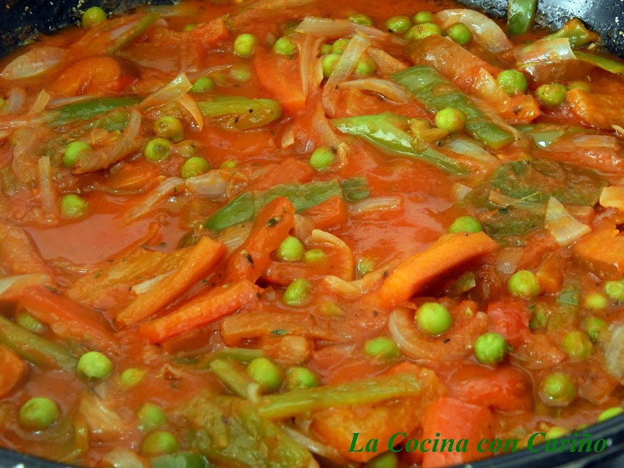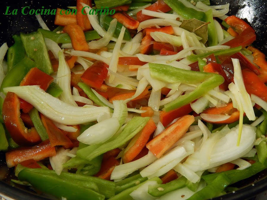 Muy bien, vamos al lío. En un perol, con el aceitito caliente pero a fuego medio, vamos a poner los ajos a rehogar. Cuando empiecen a oler a gloria, echamos las cebollas. No queremos que queden muy pochadas. Las sazonaremos y al minuto, pondremos los pimientos, el laurel y la guindilla. Salpimentaremos y dejaremos pochar todo junto un par de minutos. Ahora pondremos el tomate y dejaremos que pierda el agua. Mientras haremos cocido los guisantes unos minutos (5 ó 6) en agua y los habremos escurrido. Los ponemos también en nuestro guiso.