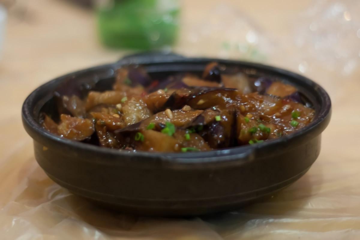 Colocar todos los ingredientes, menos la berenjena, en una olla a presión.Tapar y cocinar 50 minutos.