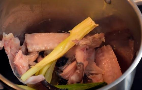 Ahora, ponemos también en la olla, las espinas del rape, la cabeza y la piel, lo llevamos al fuego y rehogamos unos 2 – 3 minutos.
