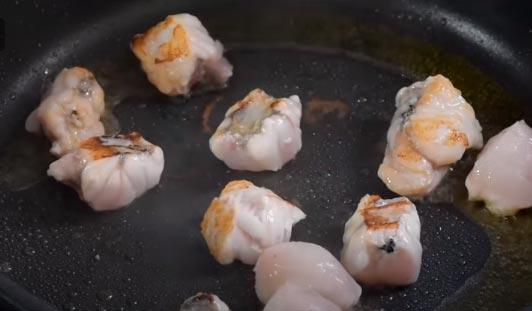 A continuación, ponemos un chorrito de aceite de oliva virgen extra en una cazuela, lo ponemos a fuego alto y cuando esté caliente añadimos los trozos de rape.