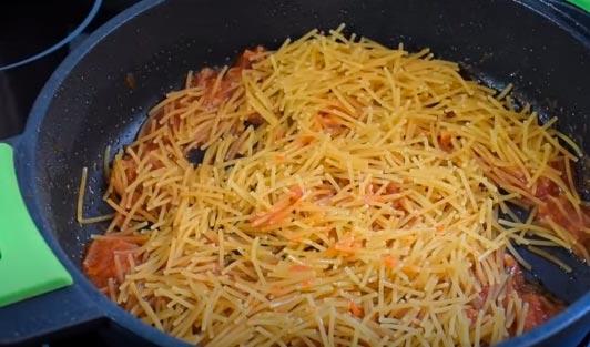 Una vez que ya tengamos hecho el tomate, ponemos los fideos (yo he usado fideos del número 4) y a fuego suave los doramos unos minutos con el sofrito para que se impregne de su sabor.