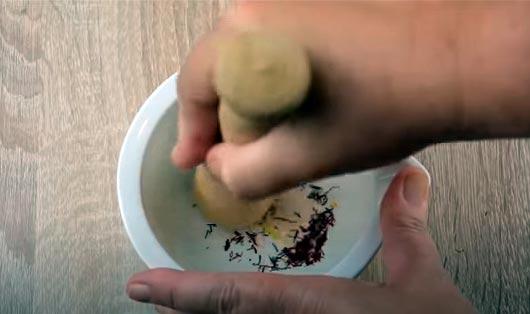 Subimos el fuego, añadimos unas hebras de azafrán que hemos machacado un poco en un mortero y disuelto en un poco de agua.