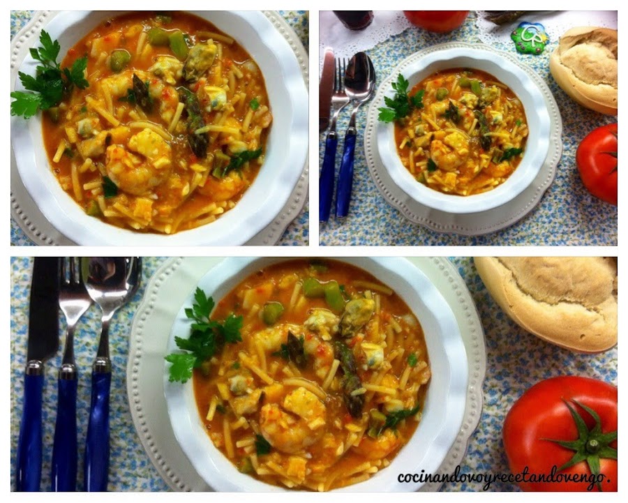 Se dice que los pescadores lo hacían con pescados diversos de lo que habían capturado (generalmente sobras que no vendían) y según temporadas eran unos u otros. En mi casa pasa igual ;-) los fideos guisados se cocinan según el pescado o marisco que tenga a mano...y en estas fechas el bacalao desalado no falta y una cajita de gambas o langostinos tampoco, por lo que esta cazuela que en mi casa es un clásico como en casi todos los hogares Malagueños, os la quiero llevar hasta vuestras casas, que la descubráis y que la saboreéis porque es una maravilla de plato, facilísimo de hacer!! Esta receta podéis prepararla en unos minutos si dejáis el fumet o caldo y sofrito listo el día anterior. En mi caso me he aprovechado de este truco muchas veces, tanto para volver a casa después del trabajo y tener el almuerzo listo en unos minutos (el tiempo que necesite los fideos), como para disfrutar de la compañía de unos amigos en fin de semana, sin manchar la cocina y sin perder toda la mañana cocinando. Así que a disfrutar de la Cazuela de Fideos que en Málaga y sus pueblos nunca falta, en sus multiples posibilidades con pescados y mariscos variados, plato extraordinario tanto para diario, como para un domingo en familia y amigos!!