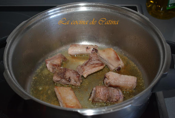 Ponemos a calentar el aceite en una cazuela y sofreímos las costillejas, una vez doradas las sacamos y las reservamos.