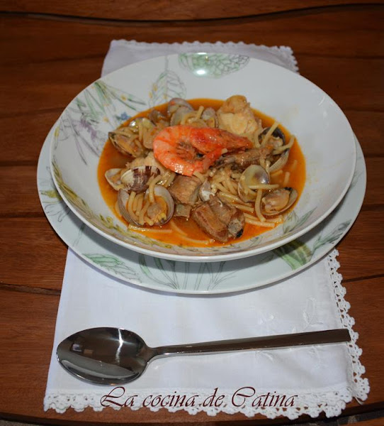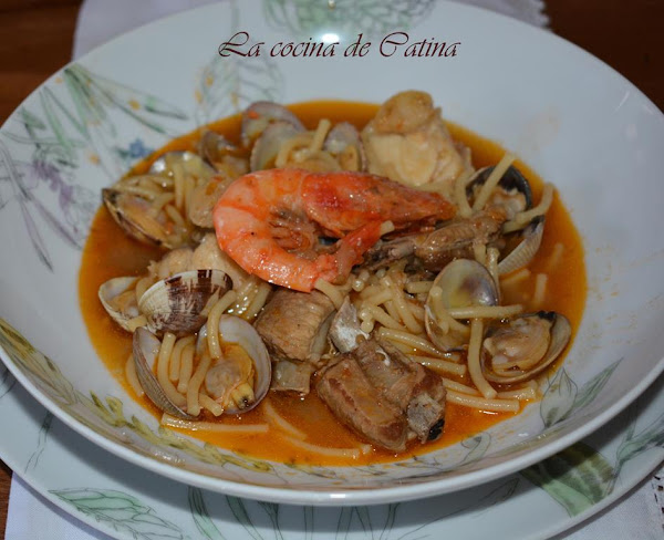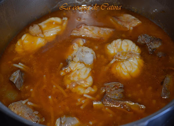 Es el momento de incorporar el vino, el caldo de pescado y las costillejas reservadas, rectificamos de sal y dejamos cocer durante 15 minutos a fuego medio. Incorporamos el pescado y los fideos, tapamos el recipiente y cocemos durante 7 minutos.