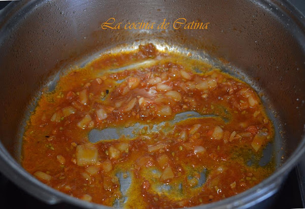 En el mismo aceite, freímos el ajo y la cebolla picados durante unos minutos a fuego lento. Cuando la cebolla está blandita, añadimos el tomate pelado y rallado, dejamos freír unos minutos hasta que se evapora toda el agua del tomate y añadimos el pimentón, mezclamos todo bien.