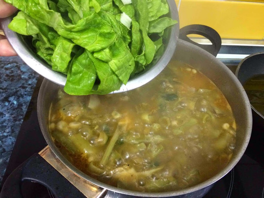 Dejamos hervir durante 20 minutos y añadimos la lechuga limpia y cortada en tiras finas. Tras un par de minutos apartamos del fuego.