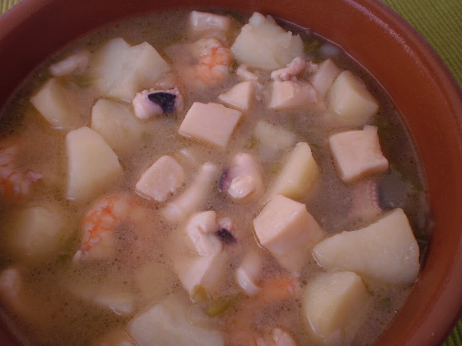 Ingredientes: Una jibia (también se puede preparar con calamar), una cebolla, un pimiento, dos o tres dientes de ajo, un vaso de vino blanco, un vaso de agua, dos patatas medianas, un cucharón de aceite de oliva virgen, 6 granos de pimienta negra, doce langostinos pelados y sal.
