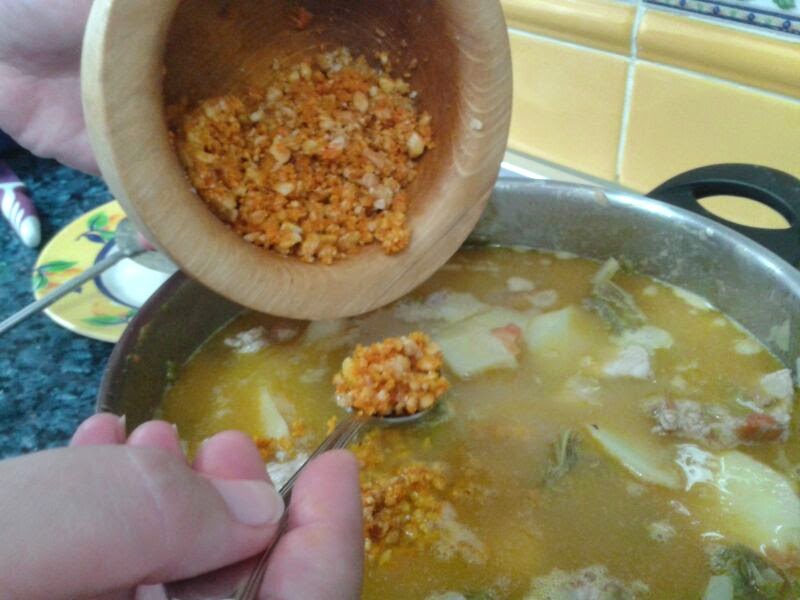 Es el momento de poner en la cazuela el "majaíllo". Si vemos que tiene poco color podemos ponerle un poco de colorante.