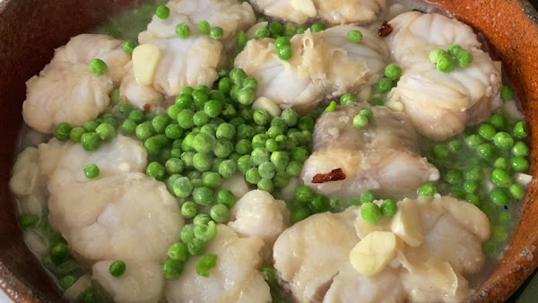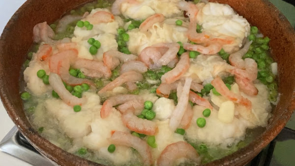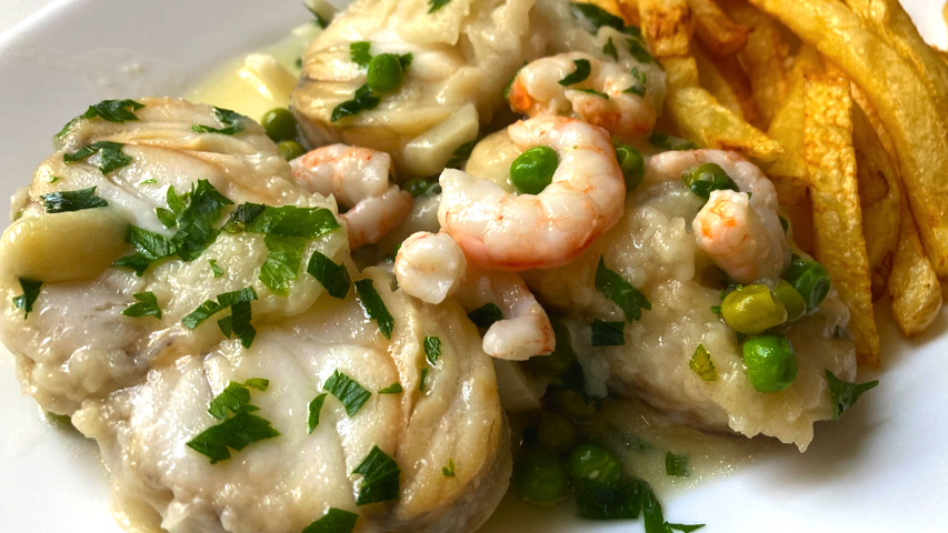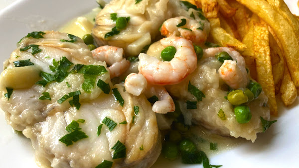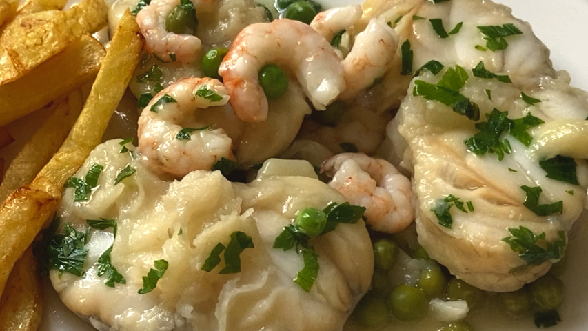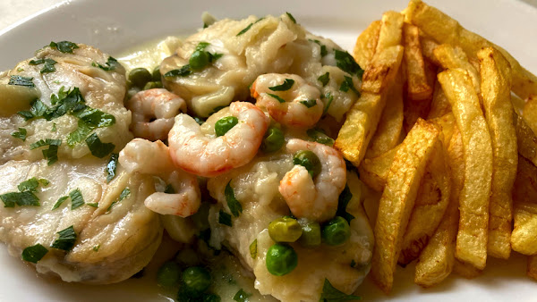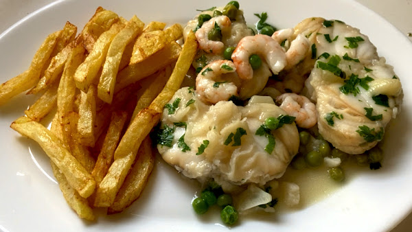 Sirve el rape con gambas y guisantes con algo de salsa y acompañado de las patatas fritas.