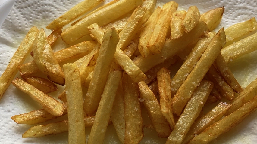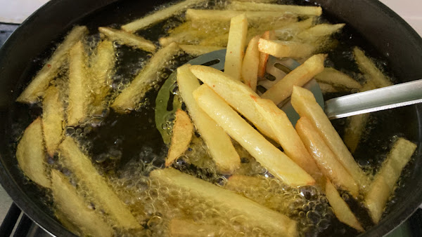 Fríe las patatas de guarnición hasta que estén bien doradas. Sácalas a una fuente con un papel absorbente y sazónalas.