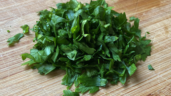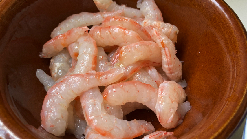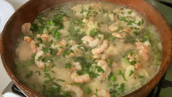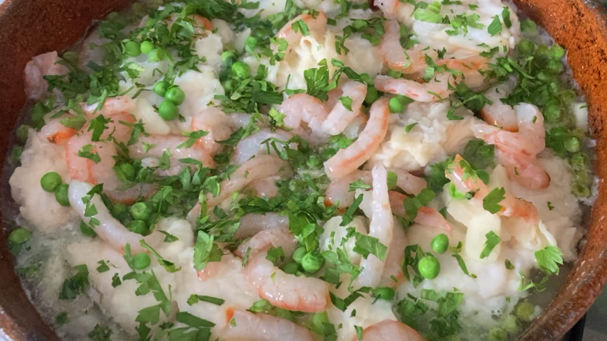 Introduce las gambas y cubre con perejil fresco picado, apaga el fuego y tapa un par de minutos para que las gambas se cuezan.
