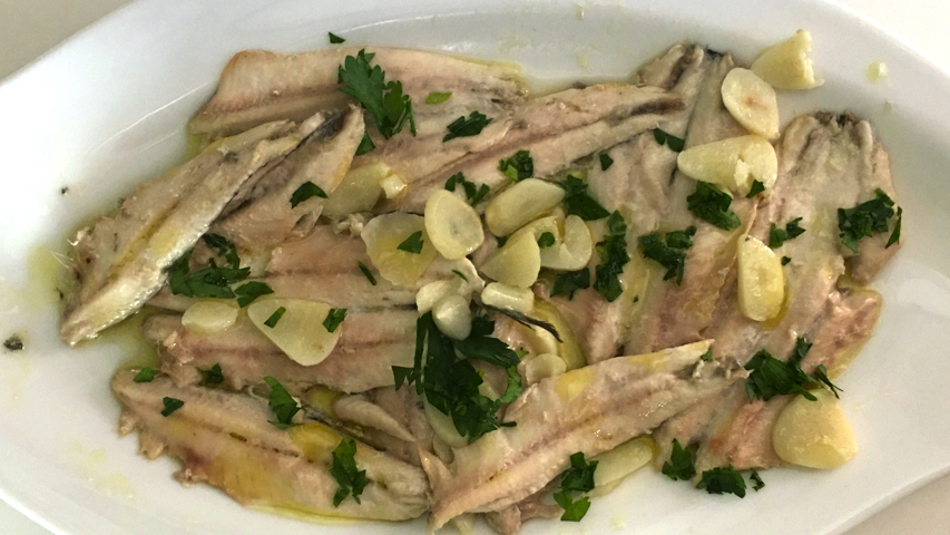 Pela unos ajos, córtalos en láminas finas y repártelas sobre los boquerones.