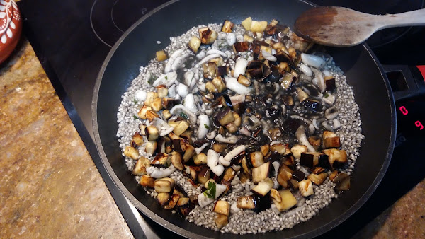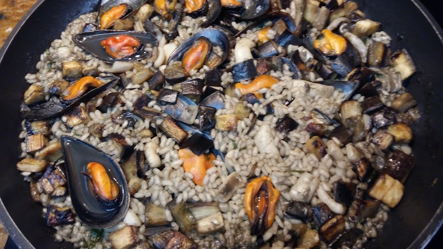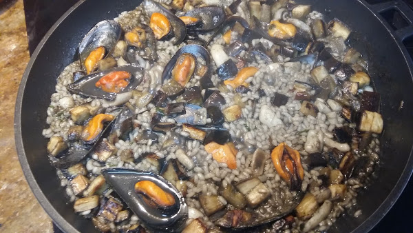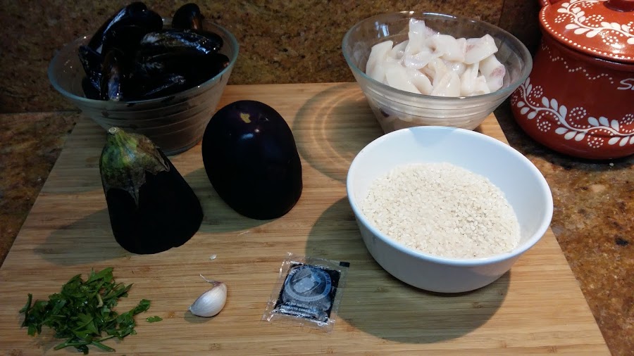 1 Berenjena grande, 200 gr de arroz bomba, 500 gr de anillas de calamar, 1 bolsita de tinta de calamar, 500 gr de mejillones, 1 diente de ajo pequeño, perejil, aceite de oliva y sal. Caldo de pescado para cubrir.