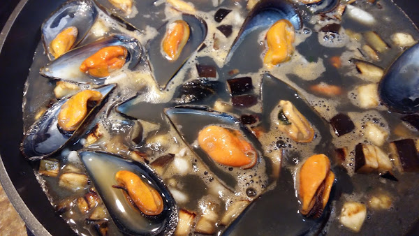 Añadimos los mejillones y cubrimos con el caldo de pescado.