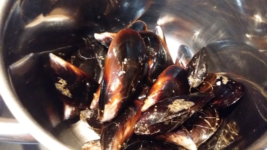 Ponemos los mejillones en una olla al fuego con un vasito de agua hasta que se abran. Colar el caldo y reservar y a parte reservar los mejillones quitándoles una de las conchas.