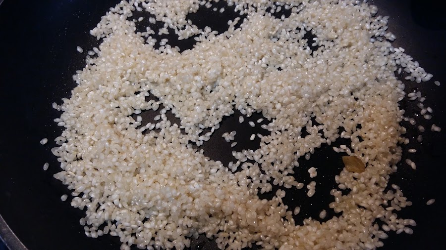 En la paellera donde hemos salteado los calamares, echamos unas gotas de aceite y doramos un poco el arroz en crudo.