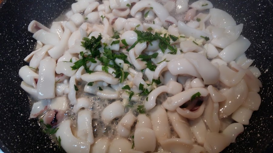 Trocear los calamares y saltearlos con un poco de ajo y perejil bien picados.