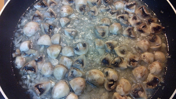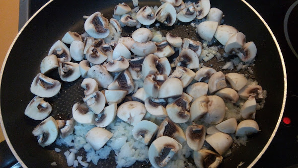Cuando empiece a ponerse transparente añadimos el ajo picadito y los champiñones. Salpimentamos y dejamos unos 7 u 8 minutos.