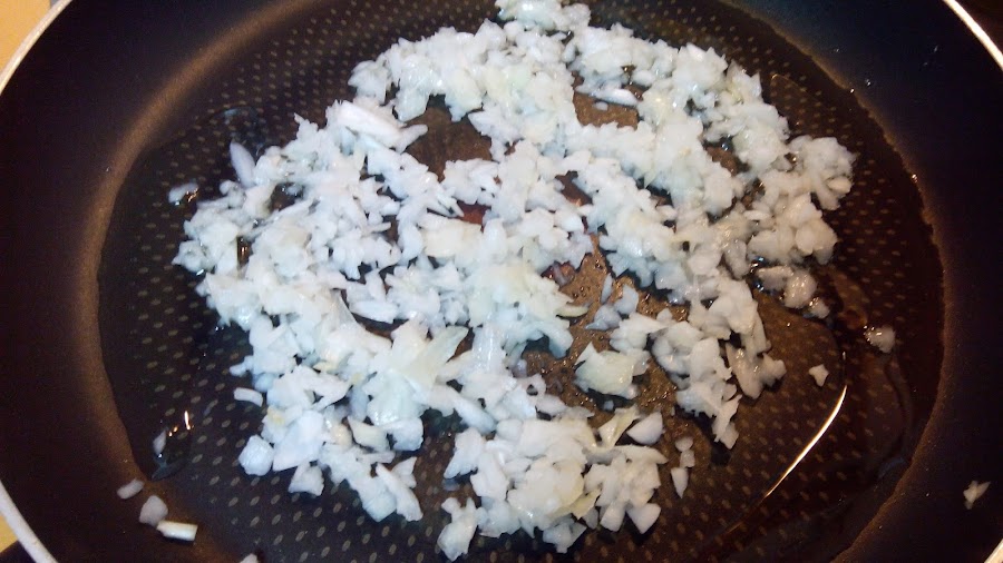 Picamos la cebolleta y la rehogamos en una sartén con un chorreón de aceite.