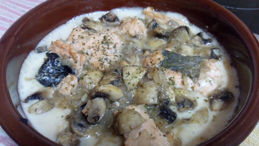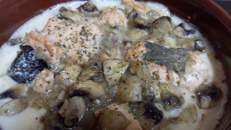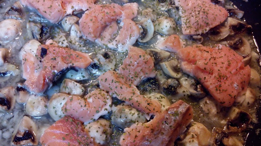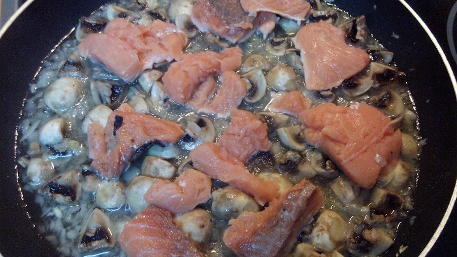 Cortamos el salmón a trozos, le quitamos la piel y lo añadimos a la sartén.