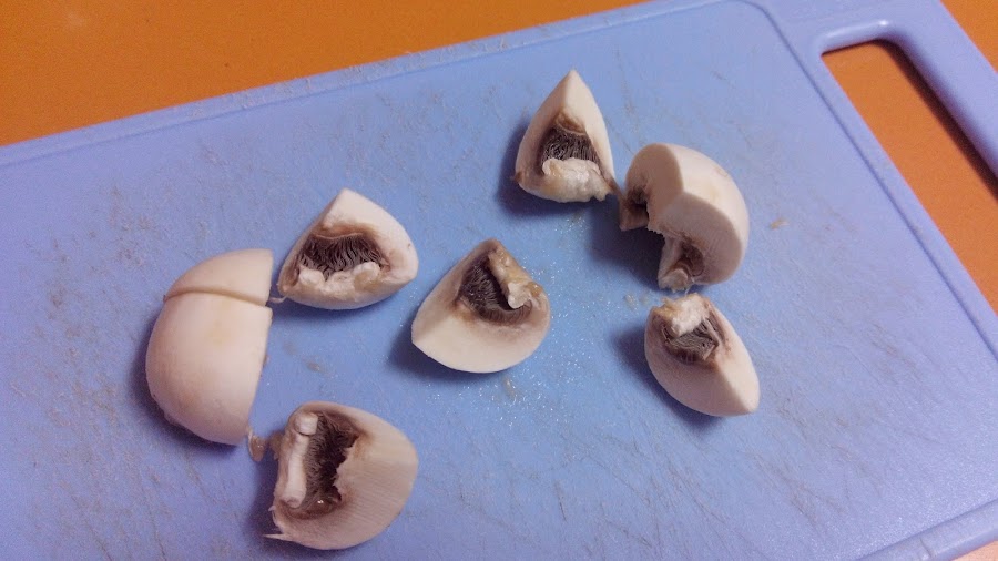 Limpiamos los champiñones y los cortamos en cuatro trozos cada uno.