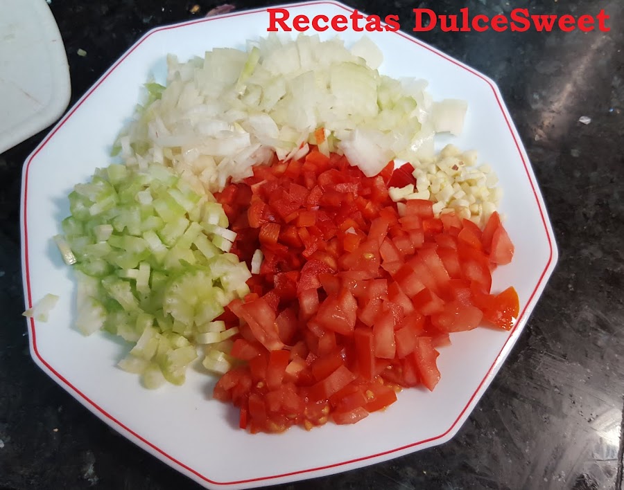 Ahora mientras se macera el pescado, cortamos todas las verduras en trocitos lo mas pequeños que podamos, la cebolla, el apio, ajo, pimiento rojo y el tomate, hay que tener que nos comemos las verduras en crudo, así que en trocitos mas pequeños sera mas fácil de hacer la digestión.
