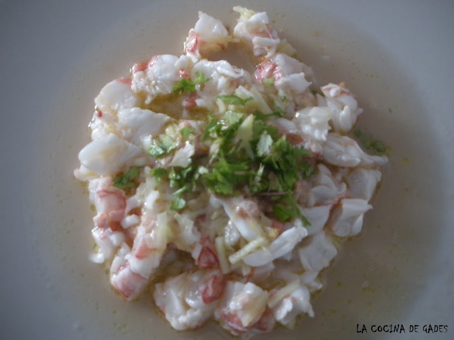 Para emplatar cortamos los gambones en cachitos, y le añadimos un poco de la maceración y encima le ponemos el cilantro fresco.