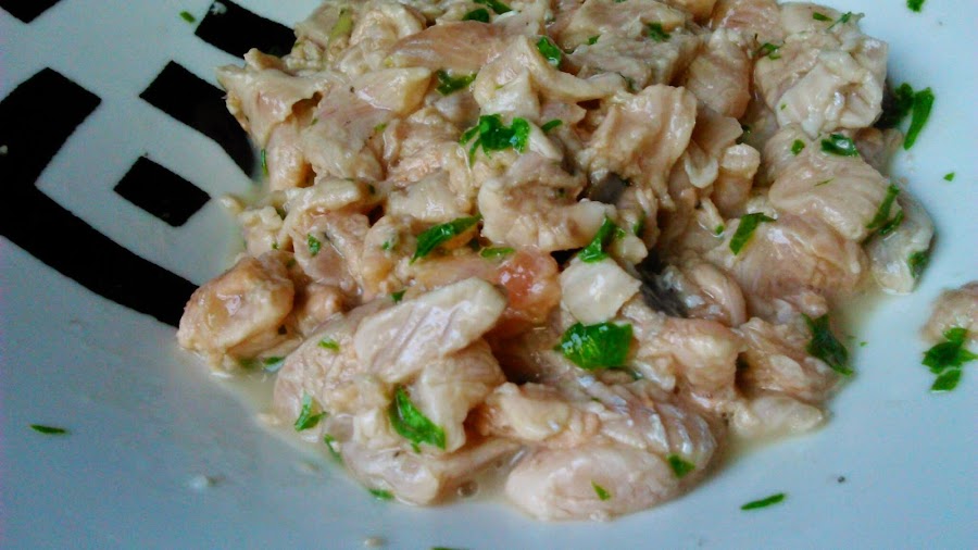 -opcional: ají molido (chile), cebolla roja,...Nos aseguramos de que no quede ninguna espina en los filetes. Los cortamos en trocitos pequeños y del mismo tamaño, sin picar, sólo troceamos.