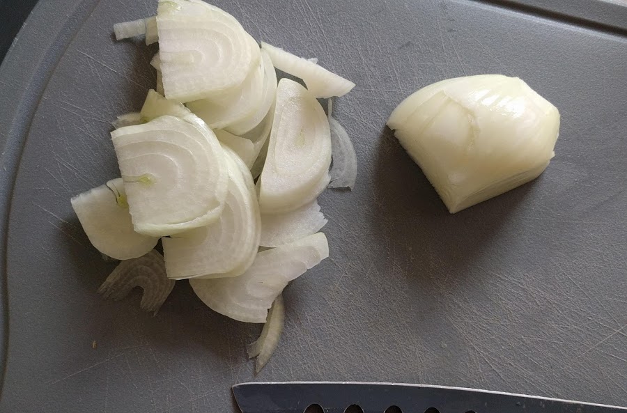 Partimos por la mitad las cebollas y cada mitad cortamos en juliana fina