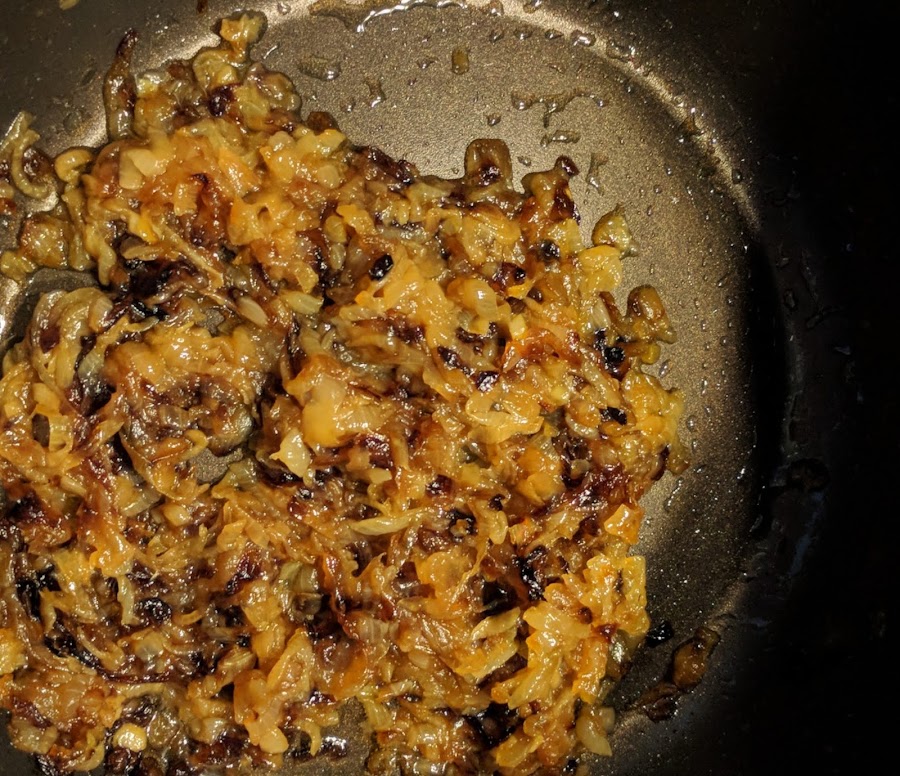 Poco a poco verás cómo va reduciendo la cebolla y cambiando de color. Al teetermi la cocción tendrá este aspecto