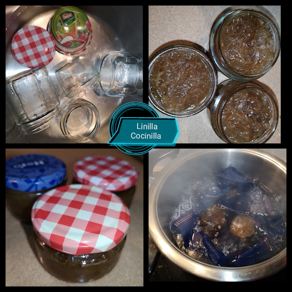 3. Ponemos una olla con agua y en ella introducimos los botes de cristal y las tapas, que los cubran y dejamos hervir unos 25- 30 minutos. Los apartamos y rellenamos con la cebolla caramelizada, quitando las burbujas de los botes y llenamos hasta arriba, cerramos las tapas y apretamos. Ponemos agua a calentar e introducimos una bayeta o trapo para evitar que los botes se golpeen entre sí, cuando empiece a hervir metemos los botes y dejamos que hiervan 35 minutos, se dejan reposar en la olla y cuando los retiramos se limpian bien y se verifica que las tapas estén hundidas. Etiquetamos y guardamos en lugar fresco y seco.