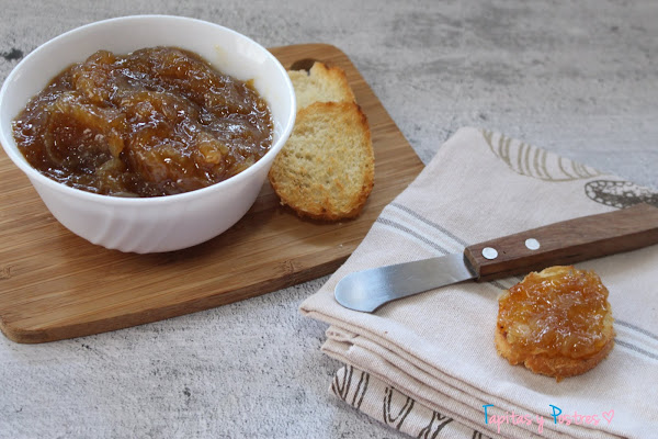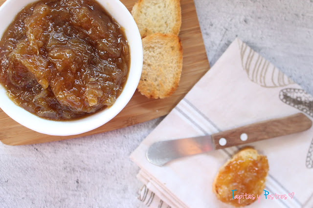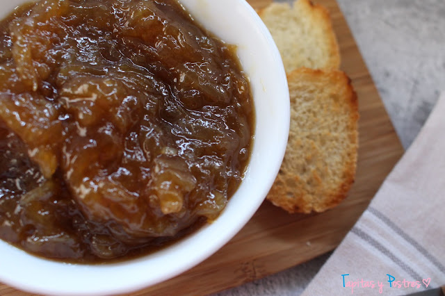 Tengo en el blog una receta de cebolla caramelizada y de mermelada de cebolla que están buenísimas. Pero esta receta tiene ligeras variaciones y además está hecha con thermomix. En fin, una excusa como otra cualquiera para preparar este entrante que da mucho juego y que está divino.