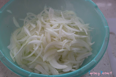 Cortamos la cebolla en juliana, prefiero cortarla así para que quede bien patente la cebolla.