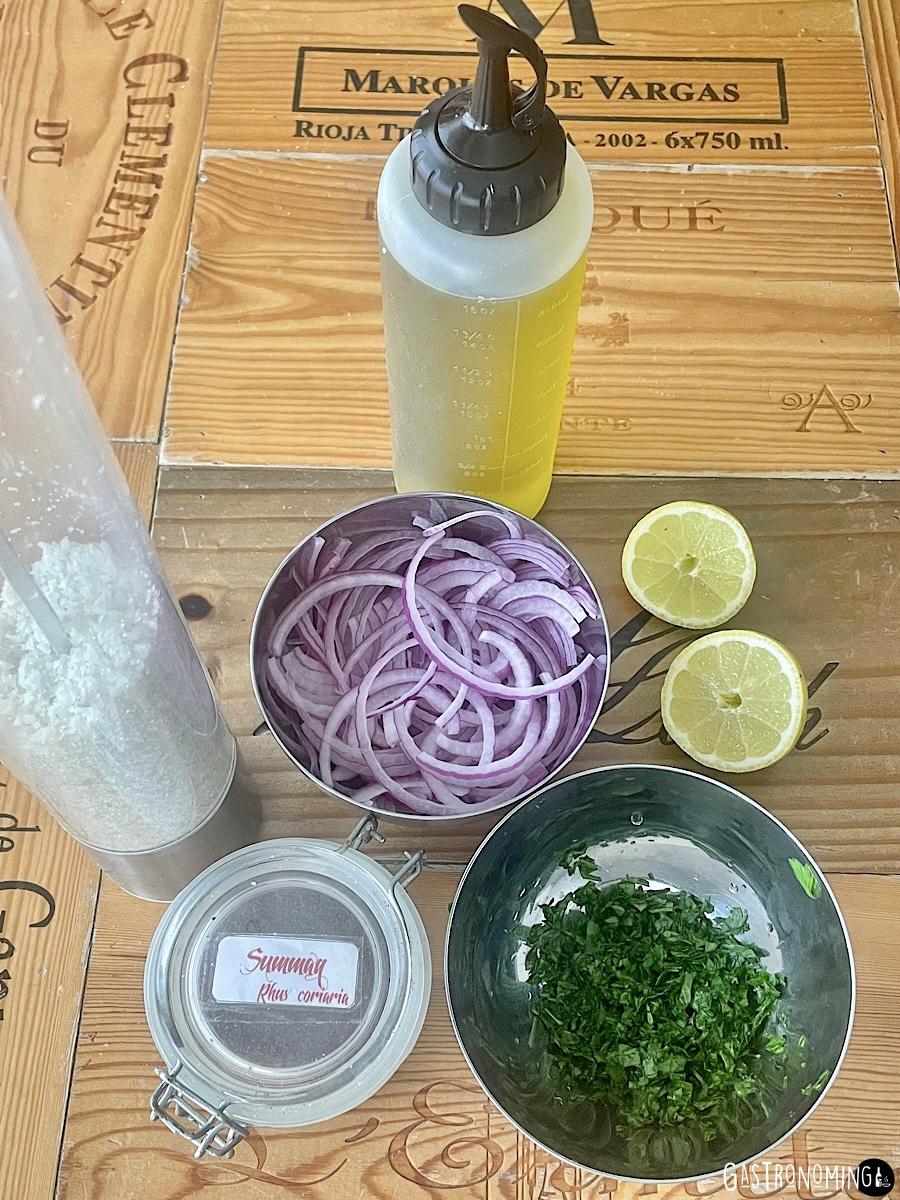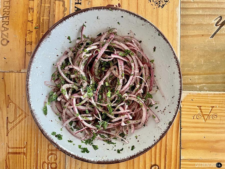 1 cebolla morada mediana cortada en juliana fina, bien lavada y escurrida