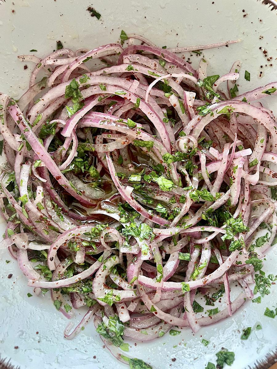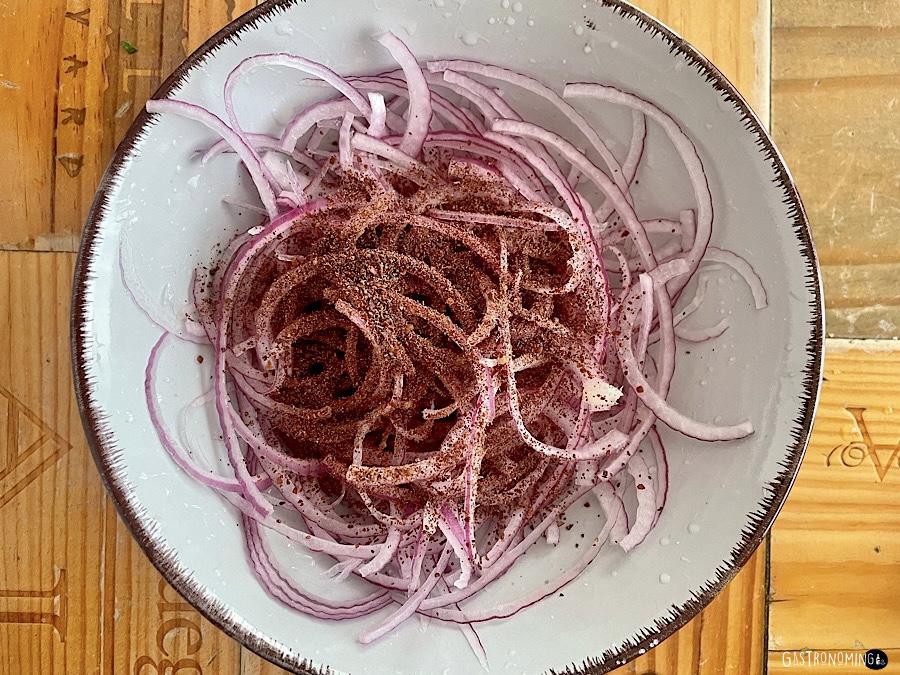 El limón, la cebolla morada y el punto ácido del sumac, hacen que esta receta sea muy fresca, pero no solo ella en sí, sino que le da un punto de frescura a todo aquello a lo que se lo eches, y eso amigo, solo pueden hacerlo muy pocas recetas, sabrás de lo que hablo cuándo lo pruebes y verás que una vez comiences a comerlo, no vas a poder parar. El crujiente de la cebolla aporta la textura crispy que siempre sienta bien.