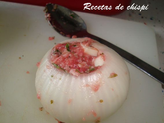 Coger una capa de cebolla con la mano manteniendola cerrada y con una cuchara rellanarla hasta los topes.