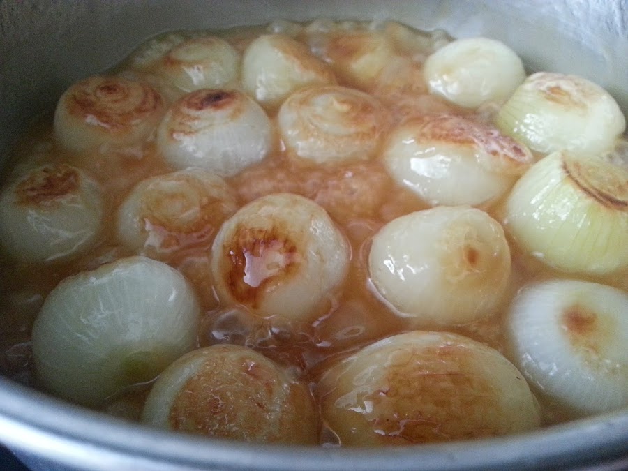 No conviene que cortéis demasiado la cebollas, para que al cocer no se os separen las capas. Que a mí me ha pasado con algunas.....