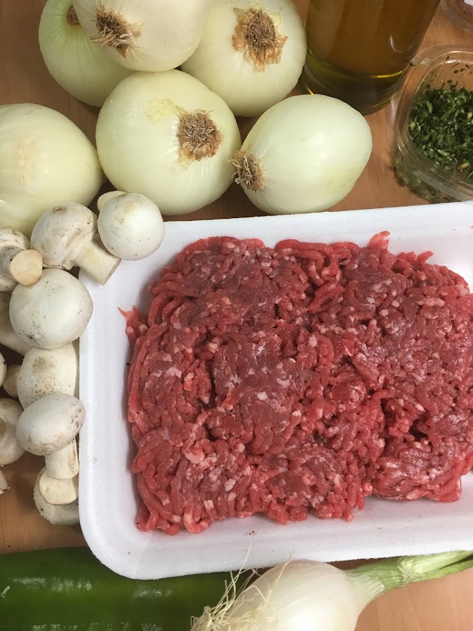 Se pican los champiñones y se añaden a la carne frita. Se guarda el interior de las cebollas para otro plato.