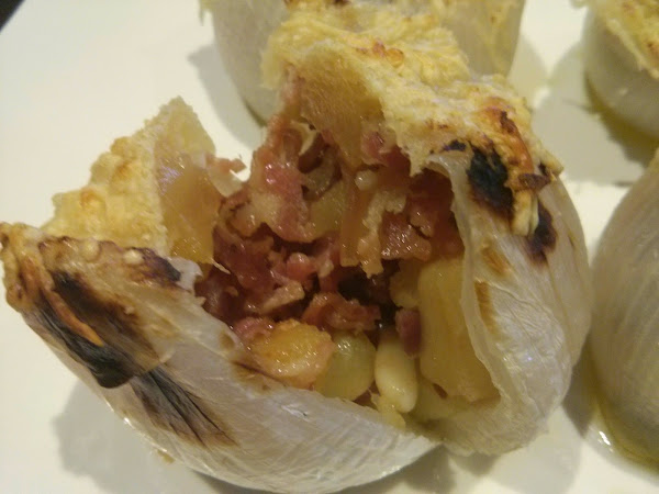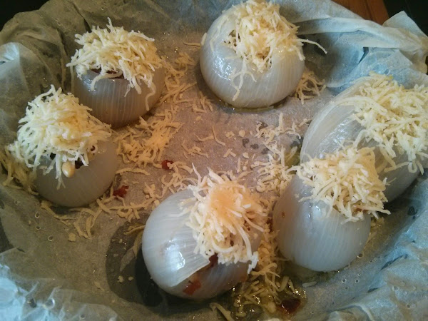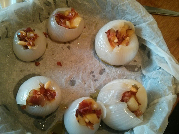 - Vaciar las cebollas y rellenar con el sofrito de bacon y manzana.