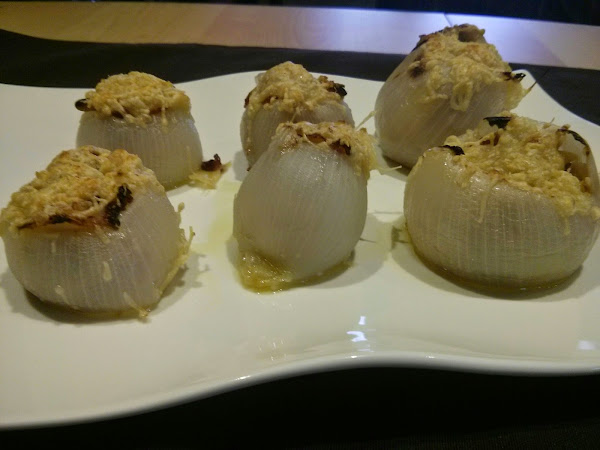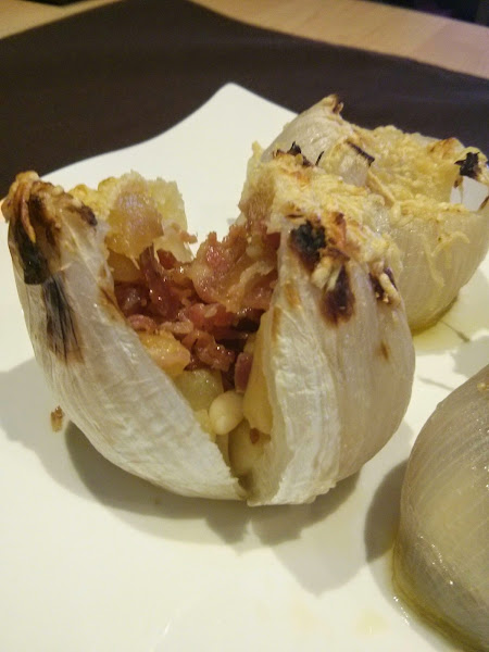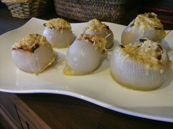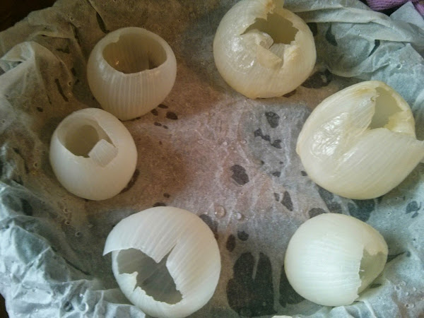 Las cebollas vaciadas. Es muy fácil, basta con clavar el cuchillo e ir haciendo una redonda, luego pinchas por el medio con el cuchillo y sale todo el relleno, solito.