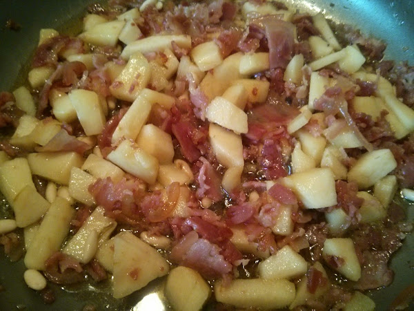 - Añadir los piñones y la manzana a daditos y sofreir hasta que esté la manzana tiernita y el bacon dorado.